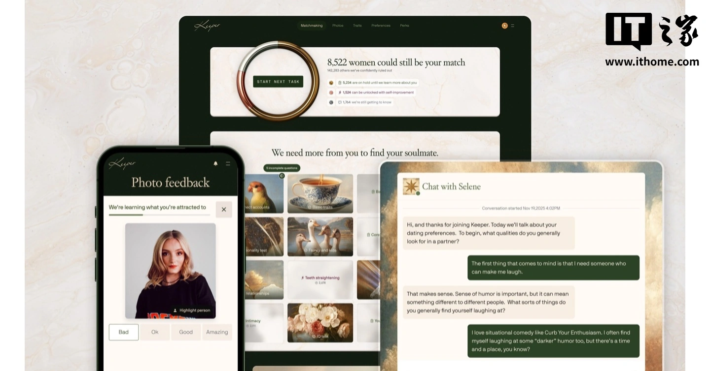 IT之家 12 月 14 日消息,人工智能婚恋初创公司 Keeper 认为,他们能帮你找到“灵魂伴侣”,如果找不到,也会如实告知。