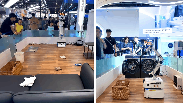 在“家庭清洁与收纳”场景中,多台机器人实现了在开放环境下的协同作业,完成杂物归类、衣物洗烘与鞋履收纳等任务,展现出一定的任务规划与灵巧操作能力。
