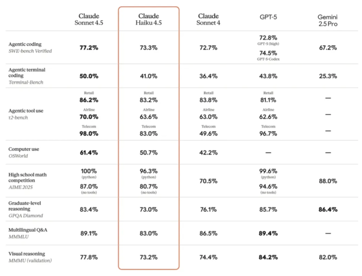 与 GPT-5 mini(约 0.25/2.5 美元)或 Gemini 2.5 Flash 相比,Haiku 4.5 的价格大约高出 4 倍,但相比 Sonnet 4.5 则便宜了约三倍,而性能几乎持平,对于开发者而言,这无疑是显著的成本优化。