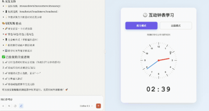 实测中,通过参考社区提示词让 Haiku 4.5 运行钟表 Demo,其代码生成速度确实更快,最终效果令人满意。在推理计算题的响应速度测试中,Haiku 4.5 的优势更为明显,突显了其在实际应用中的核心竞争力。