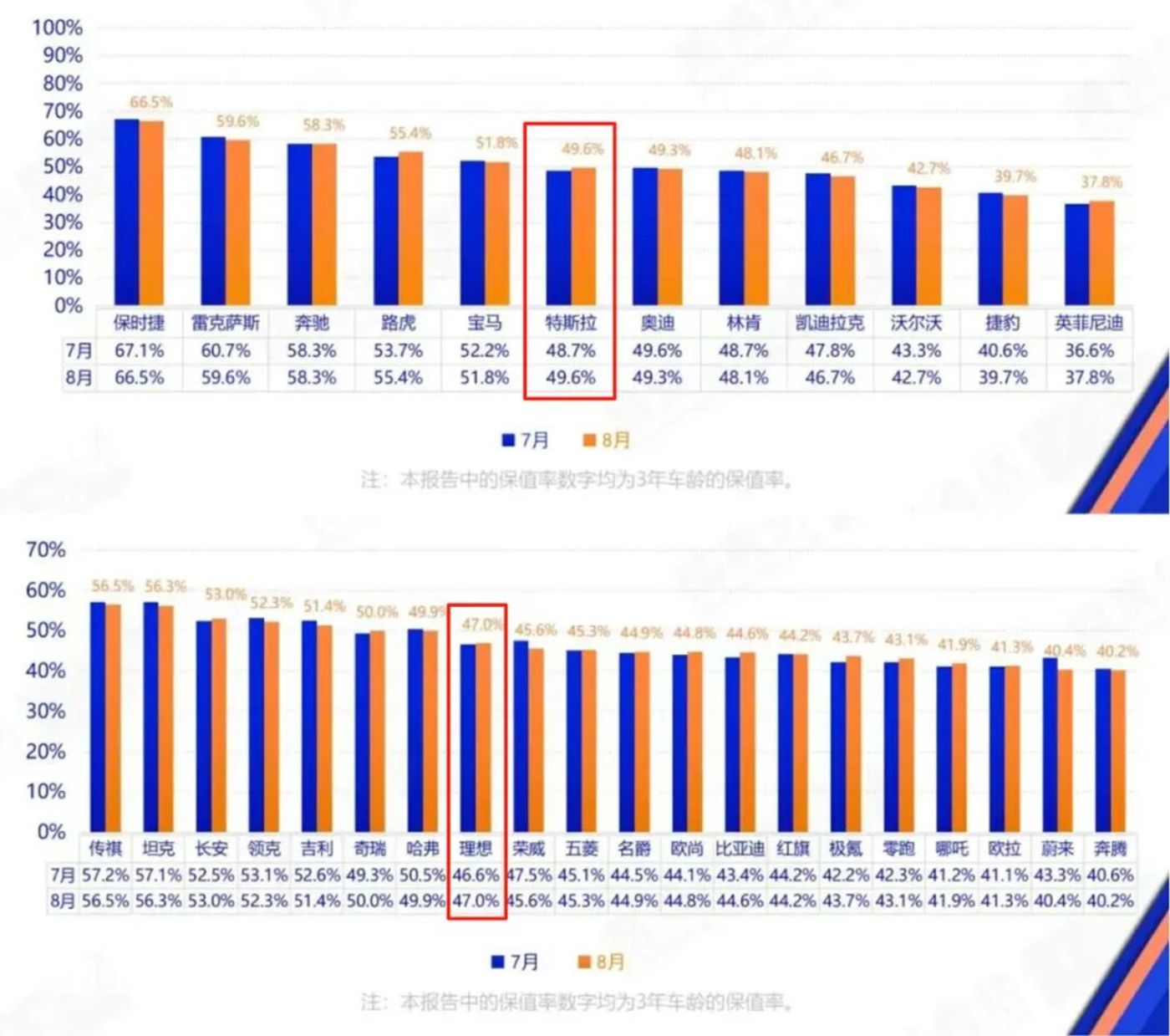 中国汽车流通协会最新数据显示,8月,特斯拉的三年保值率为49.6%,环比微涨了0.9个百分点;理想的保值率为47%,环比微涨了0.4个百分点。这些数据为销售人员购车提供了重要的信心保障,毕竟车辆的保值能力直接关系到他们的资产配置。