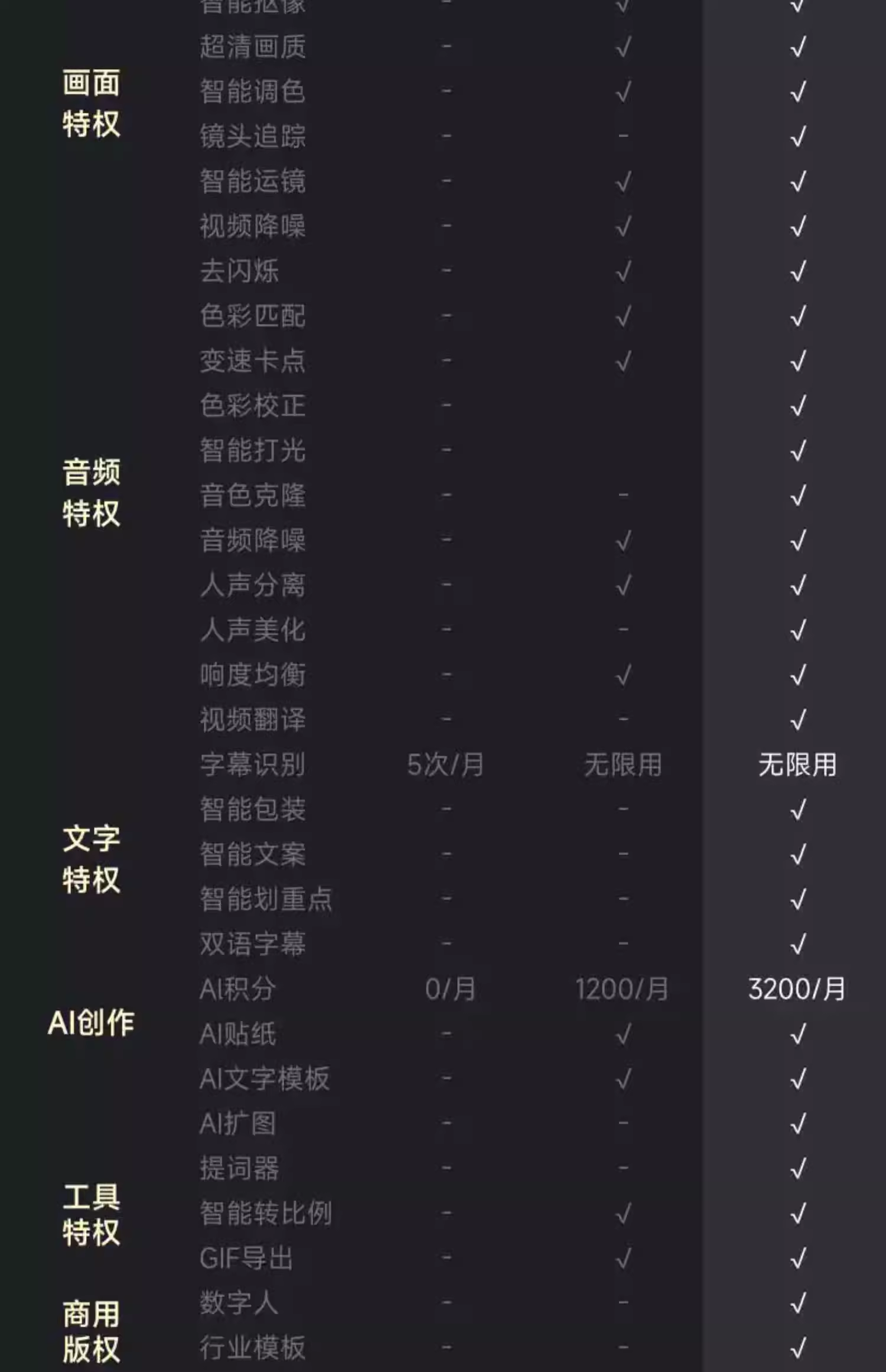 剪映去年 6 月推出 SVIP,包含多种 AI 黑科技,例如智能翻译、智能划重点、智能包装、数字人合成等。