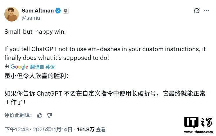 奥尔特曼在 X 平台发帖称:“如果你在自定义指令中告知 ChatGPT 不要使用破折号,它终于会按照你的要求执行了!”