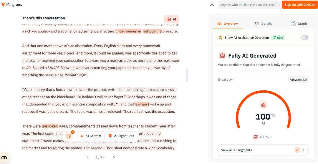 不过,令人啼笑皆非的是,小马的这篇感情饱满、“活人感”很强的文章,竟然还是被 Pangram 网站判定为 100% 由 AI 生成。