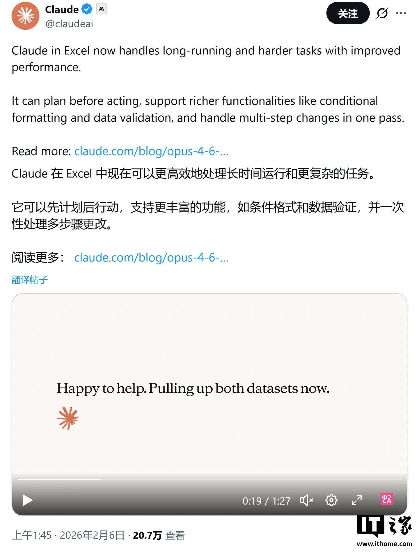 这意味着 Opus 4.6 能够直接协助用户运行财务分析、进行行业研究,甚至自动创建电子表格和演示文稿,将 AI 的能力从单纯的对话扩展到了实际的文档创作与数据处理中。IT之家附上演示视频如下: