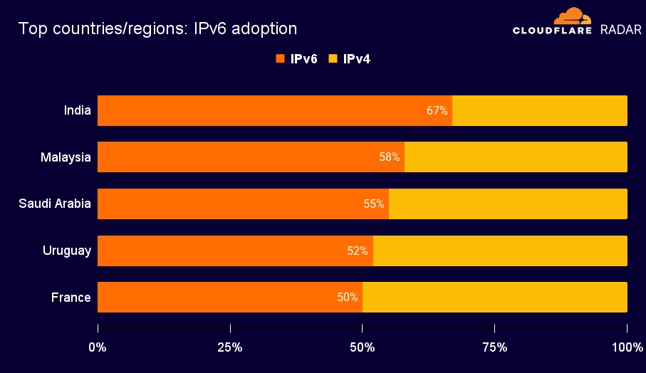 IPv6 流量占比微增至 29%,印度以 67% 采用率领跑全球
