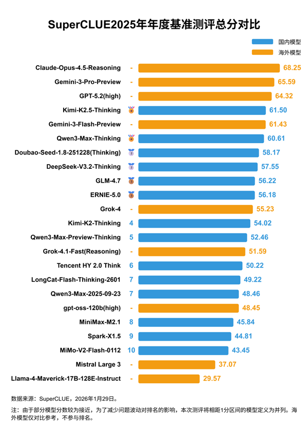 快科技2月4日消息,今天,SuperCLUE发布2025年年度中文大模型基准测评报告。