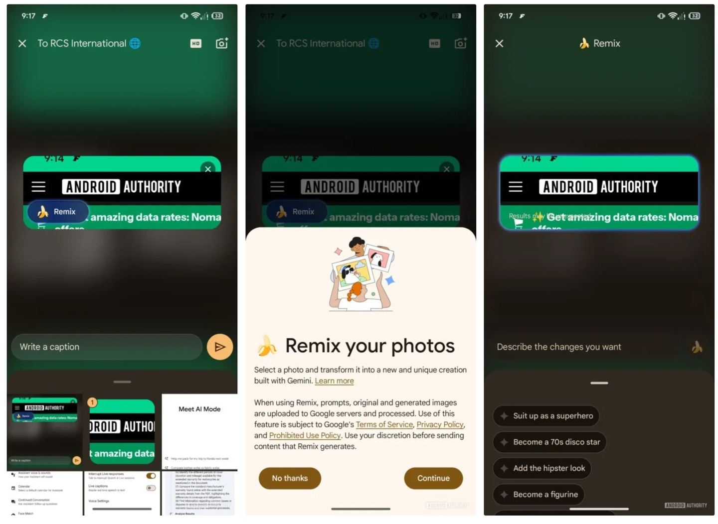 启用该功能后,用户在 Google Messages 的媒体选择器中将看到一个新增的“Remix”选项。首次使用时,系统会提示用户,为处理图像需将其发送至谷歌服务器。同意后,用户将进入一个新界面,可在此输入自定义提示词,或直接选用系统推荐的提示词来编辑所选图片。