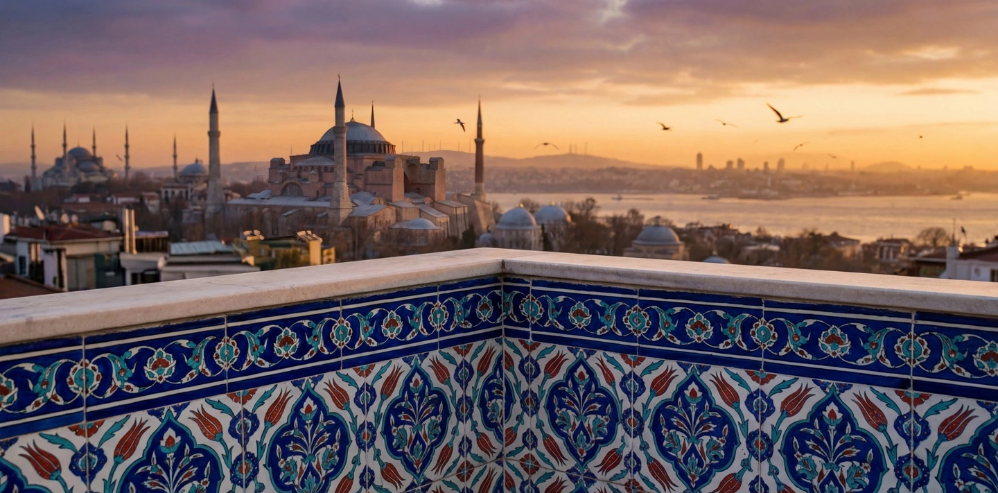 提示词:A cinematic, wide-angle view of Istanbul during the golden hour. In the foreground, intricate Ottoman tile patterns on a balcony railing are in sharp focus. In the background, the Hagia Sophia and the Blue Mosque dominate the skyline across the Bosporus, silhouetted against a warm, hazy orange and purple sunset. Seagulls are flying in the distance. Photorealistic, 8k resolution. —ar 2:1