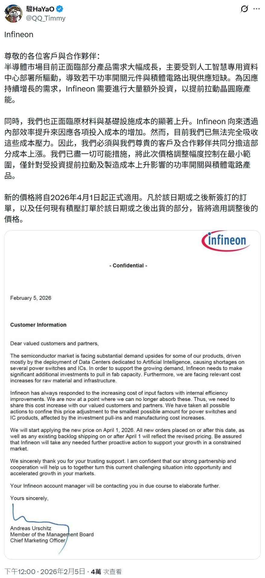 IT之家 2 月 7 日消息,爆料人士 @QQ_Timmy 前天在 X 平台发文,曝光英飞凌致客户函件,显示该公司即将提高多款电源开关 / IC 元件价格,4 月 1 日起生效。