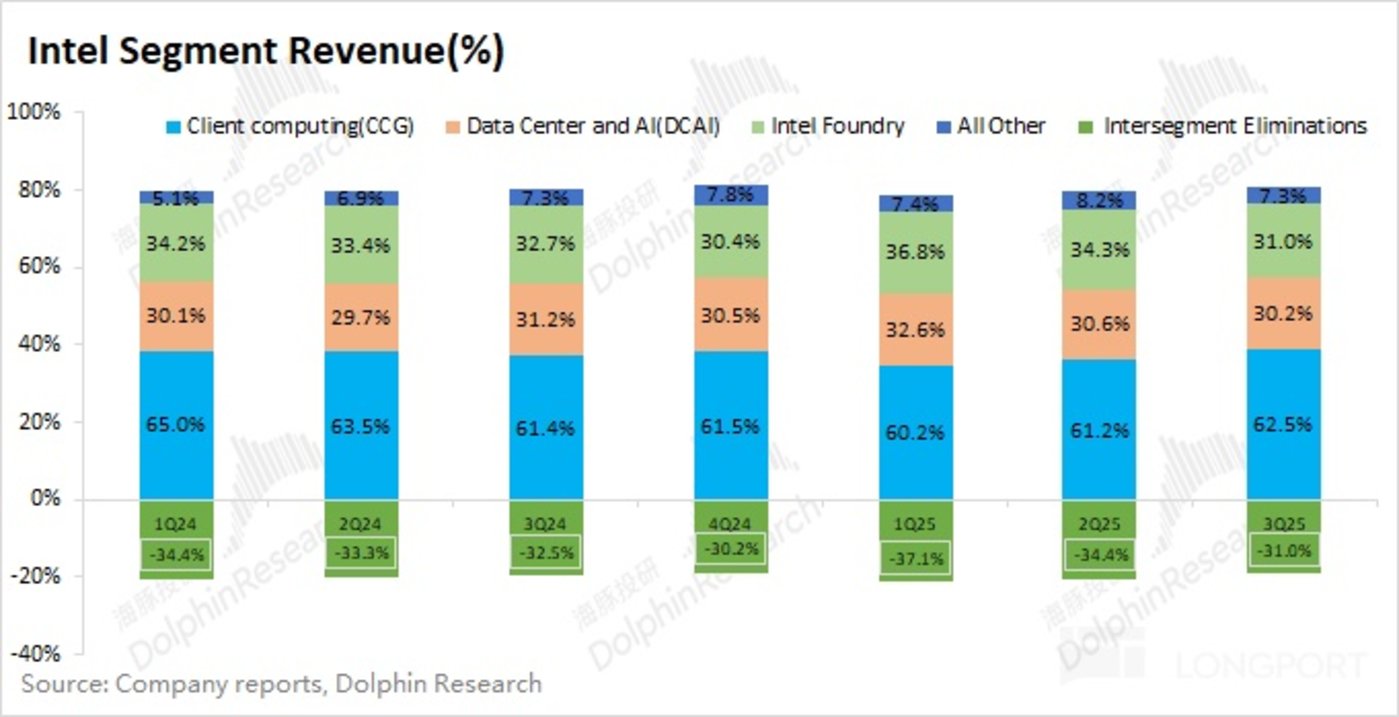 英特尔在更换 CEO 后,公司在上季度对业务的披露口径再次调整。英特尔将自有产品业务分为客户端业务和数据中心及 AI 两部分,其余还有晶圆代工和所有其他业务。