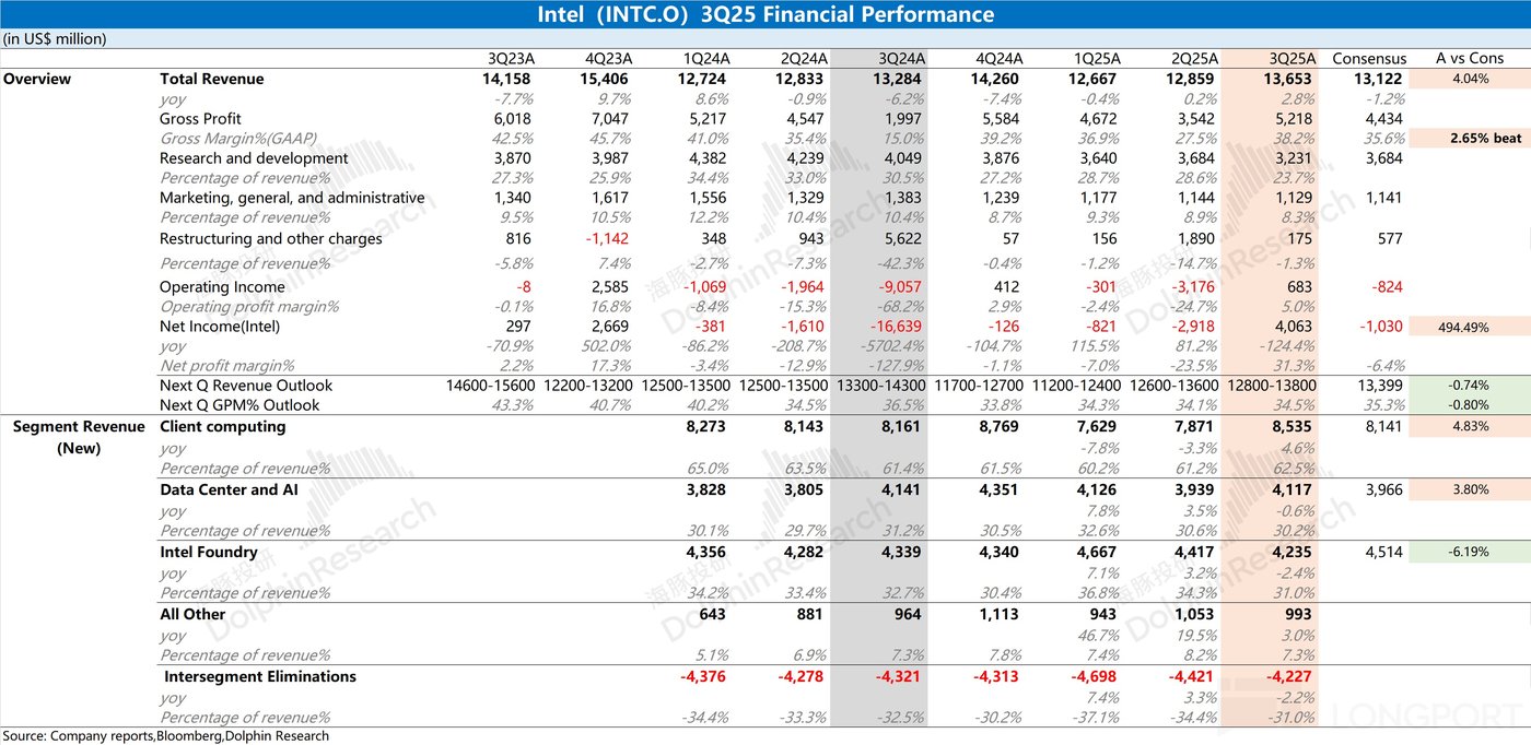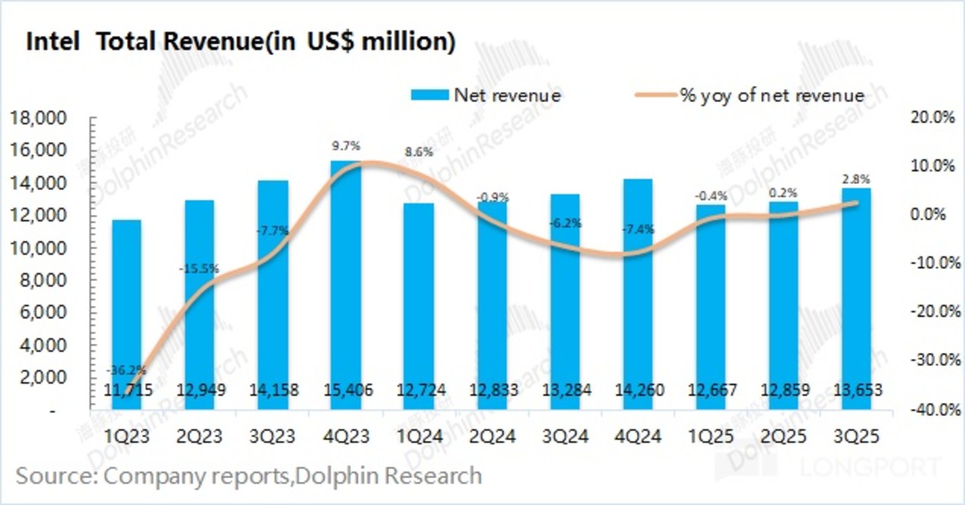 1.1 收入端:英特尔在 2025 年第三季度实现营收 136.5 亿美元,同比增长 2.8%,超出公司指引区间(126-136 亿美元)。