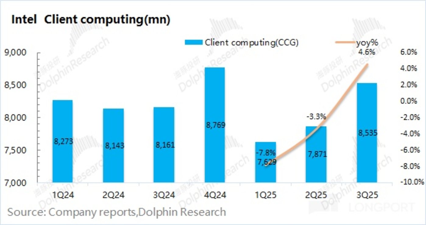 英特尔的客户端收入在 2025 年第三季度实现 85.4 亿美元,同比增长 4.6%。本季度增长,主要得益于 PC 市场回暖和下游客户备货需求的增加。