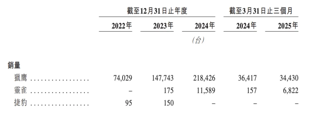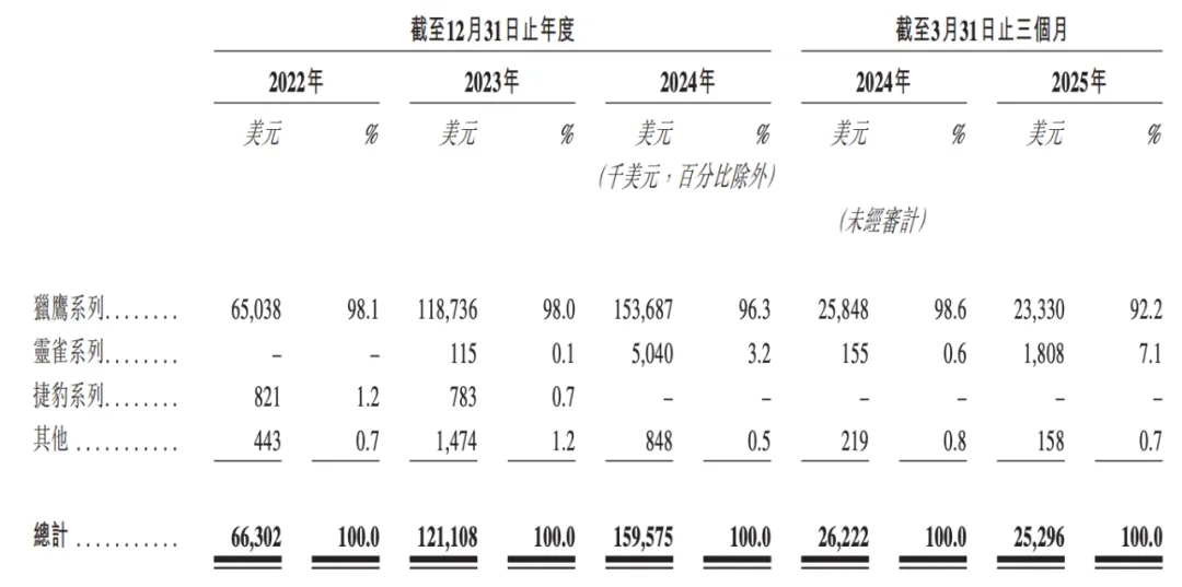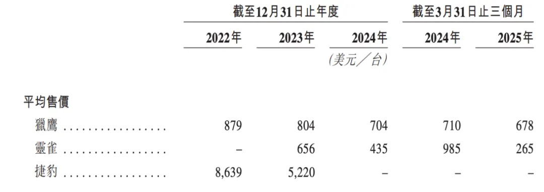 招股书显示,2025年前三月,灵雀系列仅销售6822台,单台平均售价265美元,营收180.8万美元,占总收入的7.1%;而猎鹰系列销售34430台,单台平均售价678美元,营收2333万美元,占总收入的92.2%。