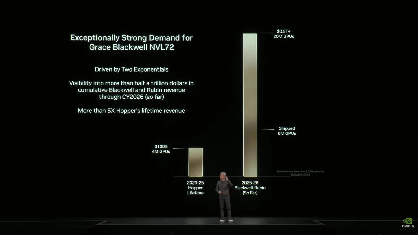 据 CNBC 报道,黄仁勋曾在 2025 年 10 月表示,英伟达在过去四个季度内出货了 600 万颗 Blackwell GPU,并预计 Blackwell 系列与下一代 Rubin 架构合计将实现 5000 亿美元(IT之家注:现汇率约合 3.53 万亿元人民币)的 GPU 销售额。