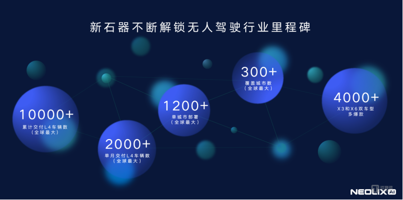 自2018年成立以来,新石器持续领跑RoboVan行业,并且近期实现了多个里程碑:累计交付L4自动驾驶车辆突破1万台车,成为全球第一家破万台的L4级车队;单月交付车辆突破2000台,成为全球首家单月突破2000台的自动驾驶公司;在青岛市部署车辆突破1200台,协助其成为全球无人驾驶车辆最多的城市;X3和X6车型累计交付数均突破4000台,成为行业中唯一实现多爆款(大规模交付SKU)批量交付的公司;部署车辆城市数突破300个,成为全球城市覆盖最多的自动驾驶公司;无人车累计L4自动驾驶里程已率先突破5000万公里,持续领先行业。