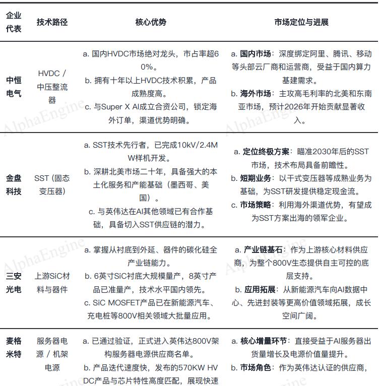 麦格米特则已成功切入英伟达800V架构的服务器电源供应商名单,展现了快速响应能力。