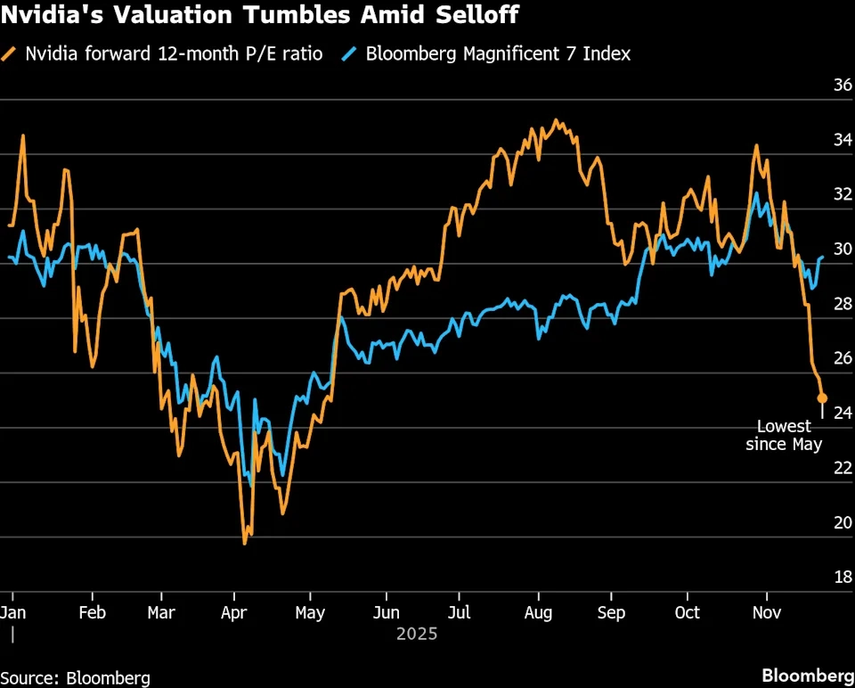 目前,英伟达远期市盈率(基于未来 12 个月预期盈利)已从本月初的约 34 倍回落至 25 倍左右。