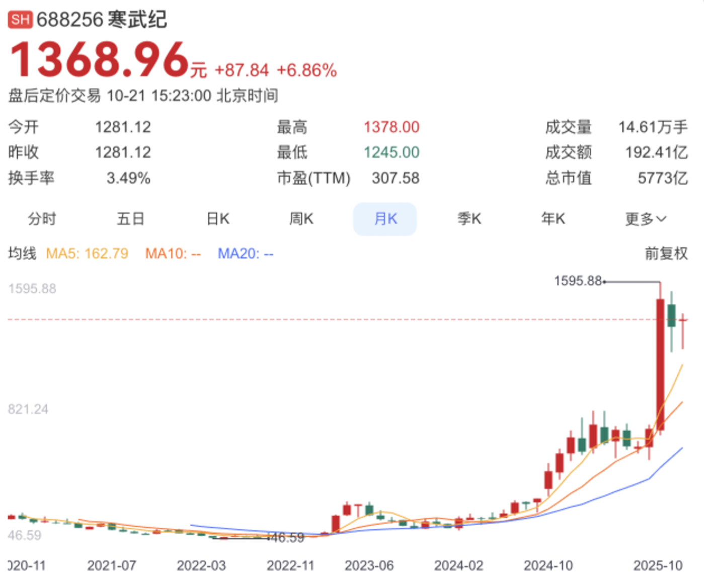 这样的业务表现,加上市场对于寒武纪未来发展的高预期,寒武纪的股价在 2025 年的持续上涨中超越茅台,并在 2025 年 8 月 28 日达到 1595.88 的历史最高点位。