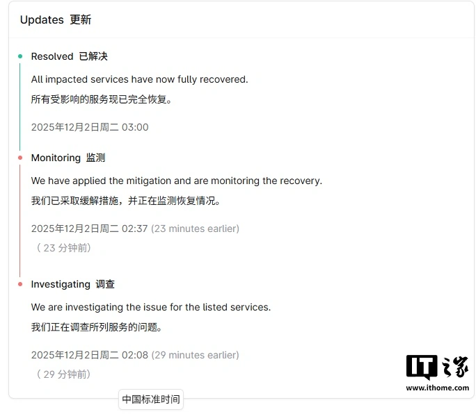 IT之家查询 OpenAI 官方状态页面,发现 12 月 2 日和 12 月 3 日均出现了状态不稳定情况。第一次故障于北京时间 12 月 2 日 2 点 08 分出现问题,并已于当天 2 点 37 分采取缓解措施,并正在监测恢复情况;于 3 点确认已完全恢复。IT之家附上相关截图如下: