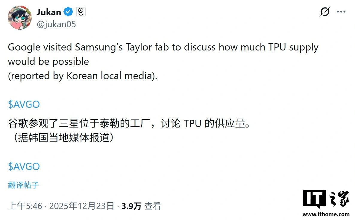 IT之家 12 月 25 日消息,消息源 @jukan05 于 12 月 23 日在 X 平台发布推文,爆料称谷歌高管近期造访了三星位于美国得克萨斯州泰勒市的半导体工厂,双方就外包生产 TPU 事宜展开了谈判。