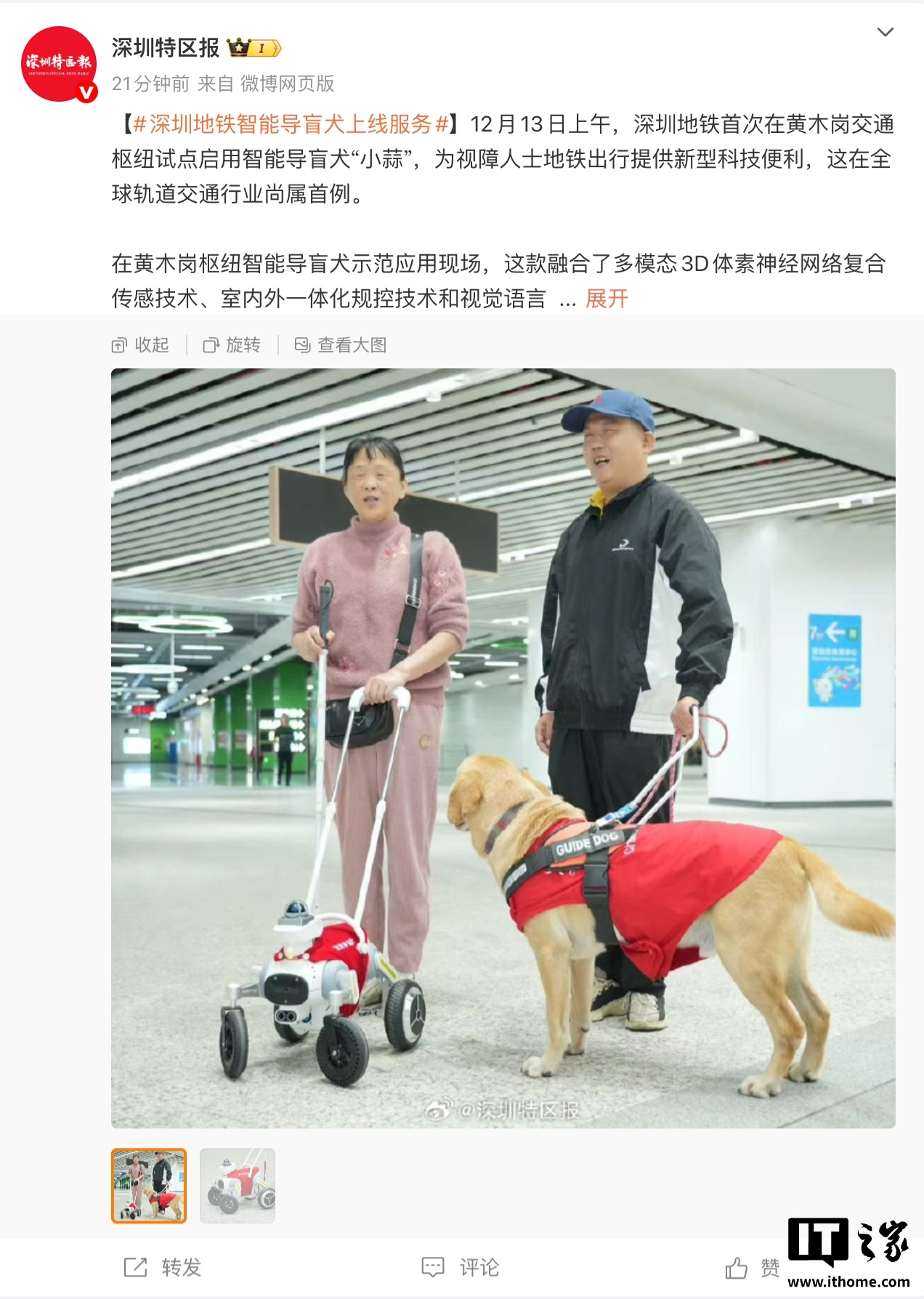 IT之家 12 月 13 日消息,据《深圳特区报》报道,深圳地铁今天首次在黄木岗交通枢纽试点启用智能导盲犬“小蒜”,为视障人士地铁出行提供新型科技便利。