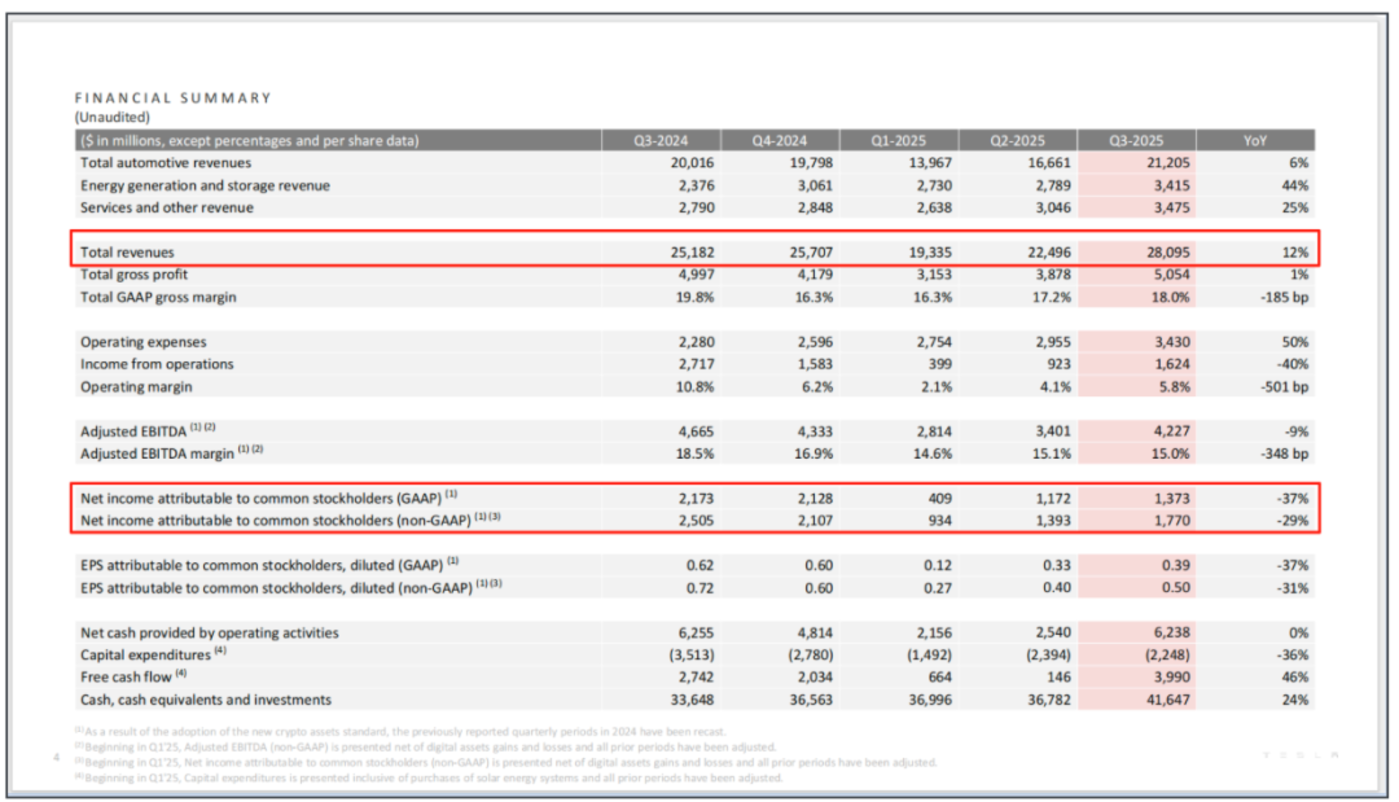 北京时间2025年10月23日,特斯拉交出了一份充满矛盾的第三季度成绩单,营收280.95亿美元,创下历史新高,同比增长12%;但净利润却同比下滑37%,仅为13.73亿美元。