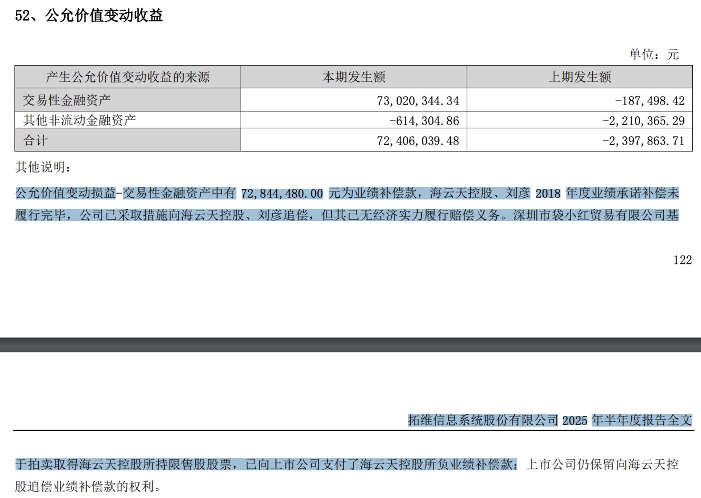 翻阅半年报可知,这笔收入是一笔业绩补偿款,今年3月,拓维信息刚通过司法途径曲折收到一笔7284万元的业绩补偿款,主要来自业绩补偿方对拓维信息旗下深圳市海云天科技股份有限公司2018年业绩的补偿。
