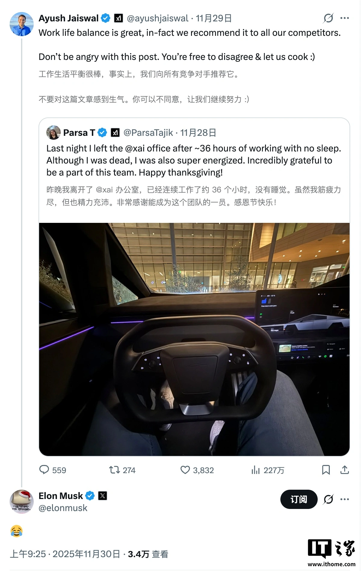 xAI 员工 Parsa Tajik 发文并配上坐在特斯拉 Cybertruck 里的照片写道:“昨晚在约 36 小时无眠工作后离开 @xAI 办公室。虽然累坏了,但精力充沛。很庆幸能加入这个团队。感恩节快乐!”帖下同事纷纷点赞、留言称赞,有人调侃他完成了“192 小时”的工作量,简直是“独角兽中的独角兽”,还有人表示能跟他共事是种幸运。