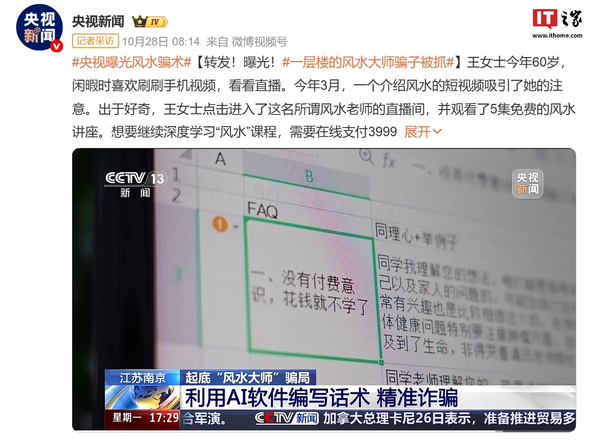 IT之家 10 月 29 日消息,央视新闻今日曝光了一起“风水大师”诈骗案细节,这些“大师”号称能替他人解决难题、改变命运。然而,他们其实是一个分工明确诈骗团队,专门利用受害者急于拯救自己亲人的心情,实施诈骗。他们甚至利用 AI 技术来编写话术,对老年人实施精准诈骗。