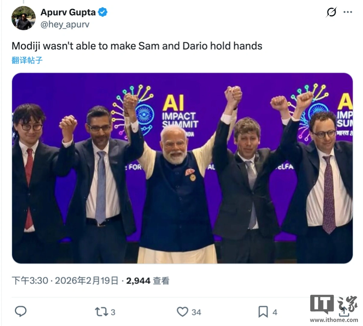 IT之家 2 月 19 日消息,据《商业内幕》报道,本周,多位全球人工智能领域领军人物齐聚新德里,原本讨论的是模型迭代与社会影响,却意外留下了一张科技圈难忘的“手牵手”照片。