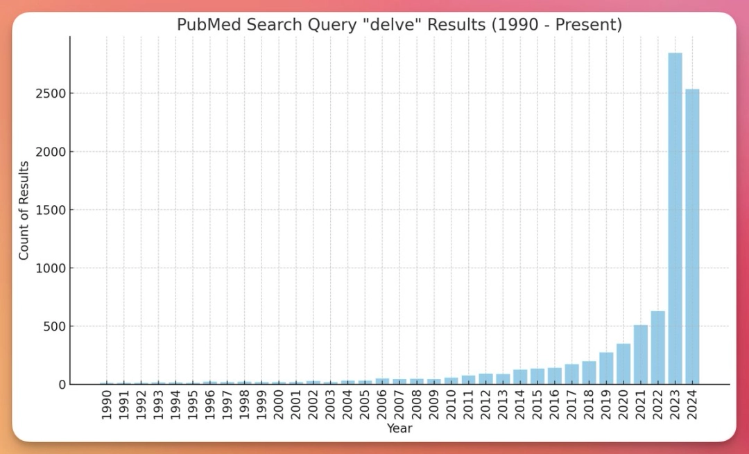 《卫报》曾有一篇文章指出,Jeremy Nguyen 这位来自墨尔本斯威本科技大学的 AI 专家发现 —— 在 PubMed 这类专业学术网站上,“delve”的出现频率在近几年激增了 10 到 100 倍。(PubMed 主要收录了 80 余国 5200+ 生物医学期刊,总量超 3900 万条文献。)