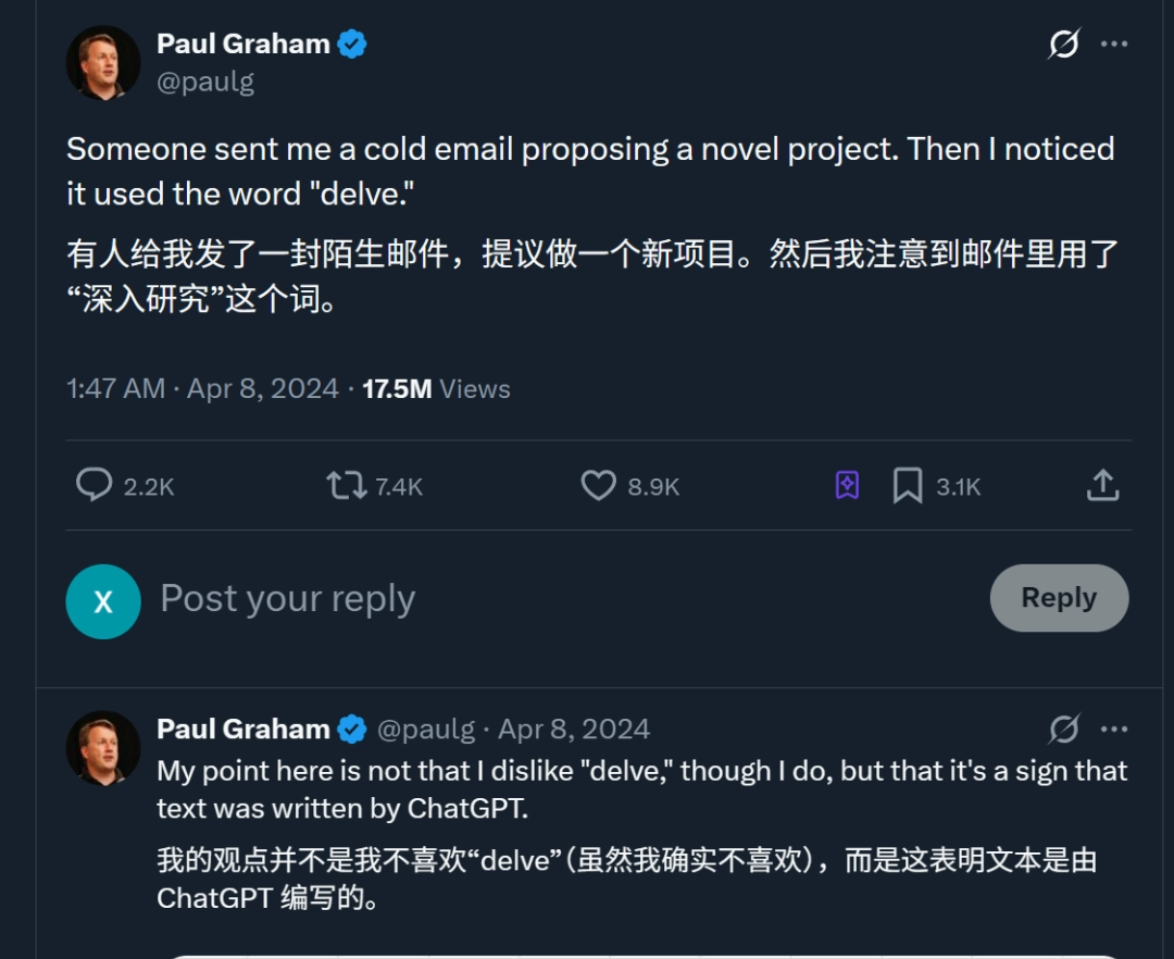 这暗示了,有大量研究人员可能在用 ChatGPT 辅助写作,并将其偏好的词汇带入了正式学术文本。这一现象还引来马斯克和 YC 联合创始人保罗・格雷厄姆的关注,后者发帖表示: