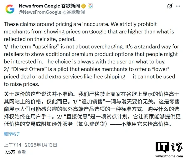 谷歌在 X 平台的推文中回应称:“这些关于定价的指控并不属实。我们严格禁止商家在谷歌平台展示高于其自有网站上的价格,这是铁律。1/ ‘追加销售’并非指漫天要价,而是零售商向消费者展示其可能感兴趣的高端产品附加选项的一种标准营销方式,最终购买决策权始终掌握在用户手中。2/ ‘直接优惠’是一项试点功能,可以让商家提供更低价格的优惠活动,或附赠免费配送等增值服务,绝不可用于抬高商品价格。”