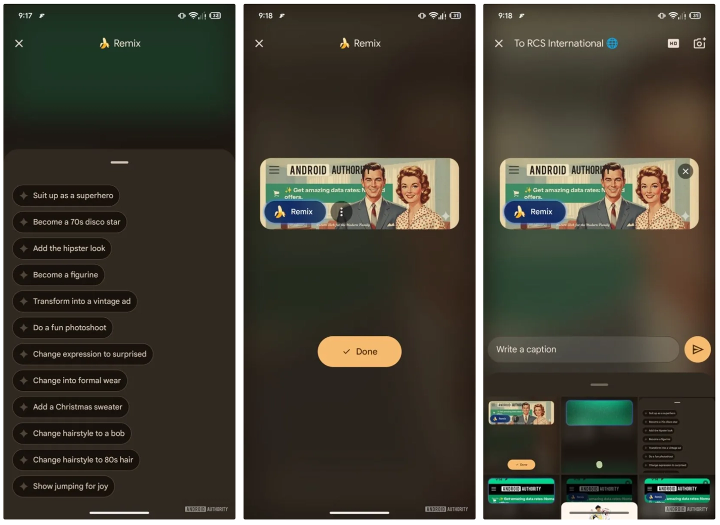 启用该功能后,用户在 Google Messages 的媒体选择器中将看到一个新增的“Remix”选项。首次使用时,系统会提示用户,为处理图像需将其发送至谷歌服务器。同意后,用户将进入一个新界面,可在此输入自定义提示词,或直接选用系统推荐的提示词来编辑所选图片。