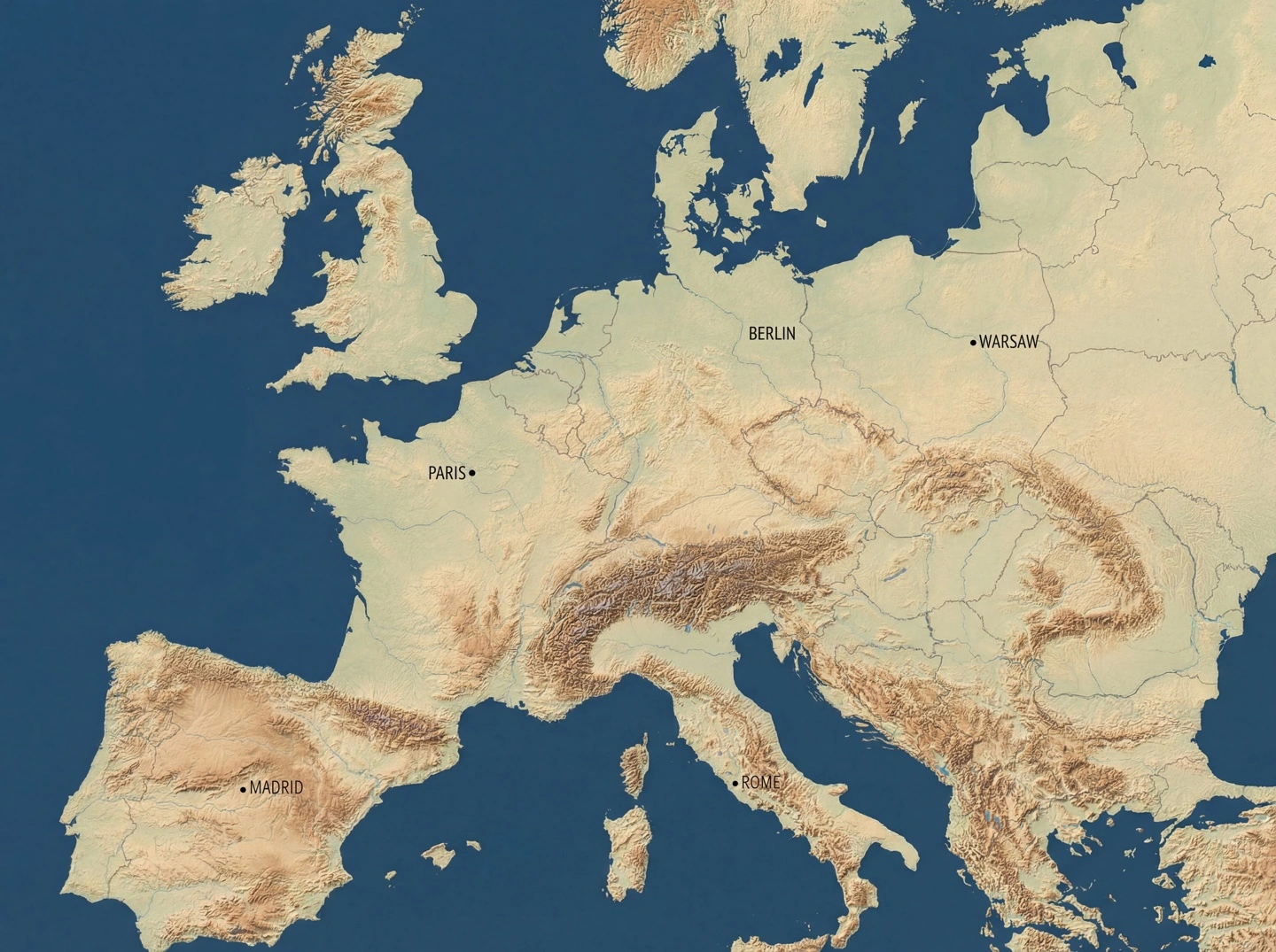 提示词:A high-resolution, professional infographic map of Europe. The map should be topographical, showing mountain ranges in relief. Clear, sharp text labels should identify major capitals: "Paris", "Berlin", "Rome", "Madrid", and "Warsaw". The ocean should be a deep matte blue, and the land should be in natural earth tones. Clean, modern typography suitable for a textbook. —ar 4:3