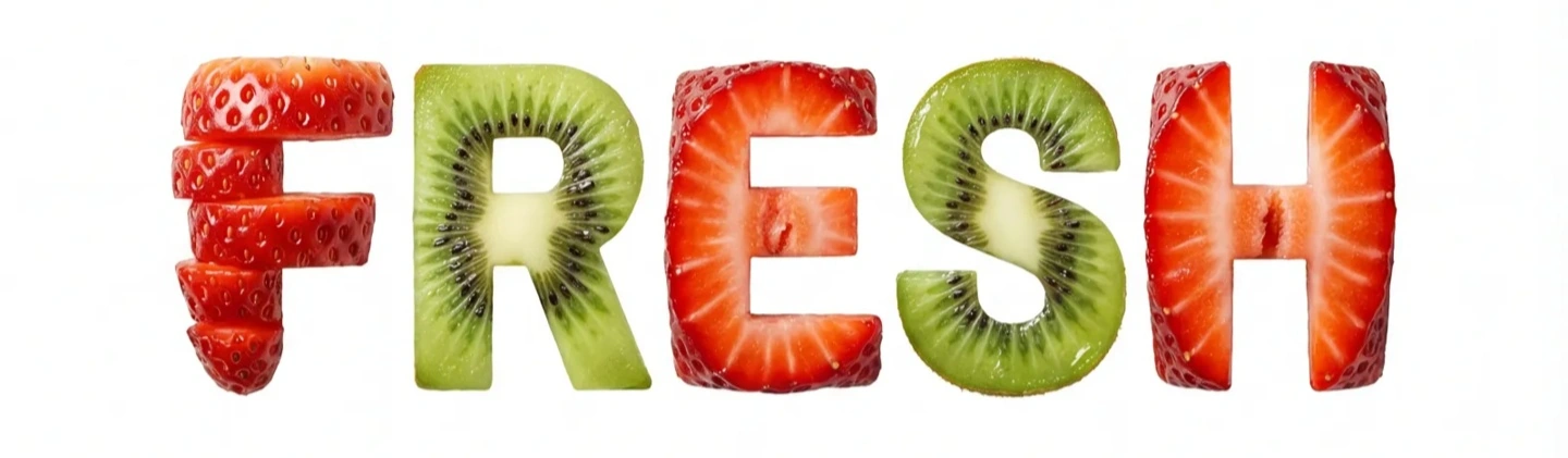 (上图为优化阅读,经过裁剪,实际比例为 1:1)提示词:A sophisticated, minimalist logo centered on a white background. The word "FRESH" is spelled out using realistic, glistening slices of kiwi and strawberry. High contrast, sharp focus, professional food photography style. —ar 1:1