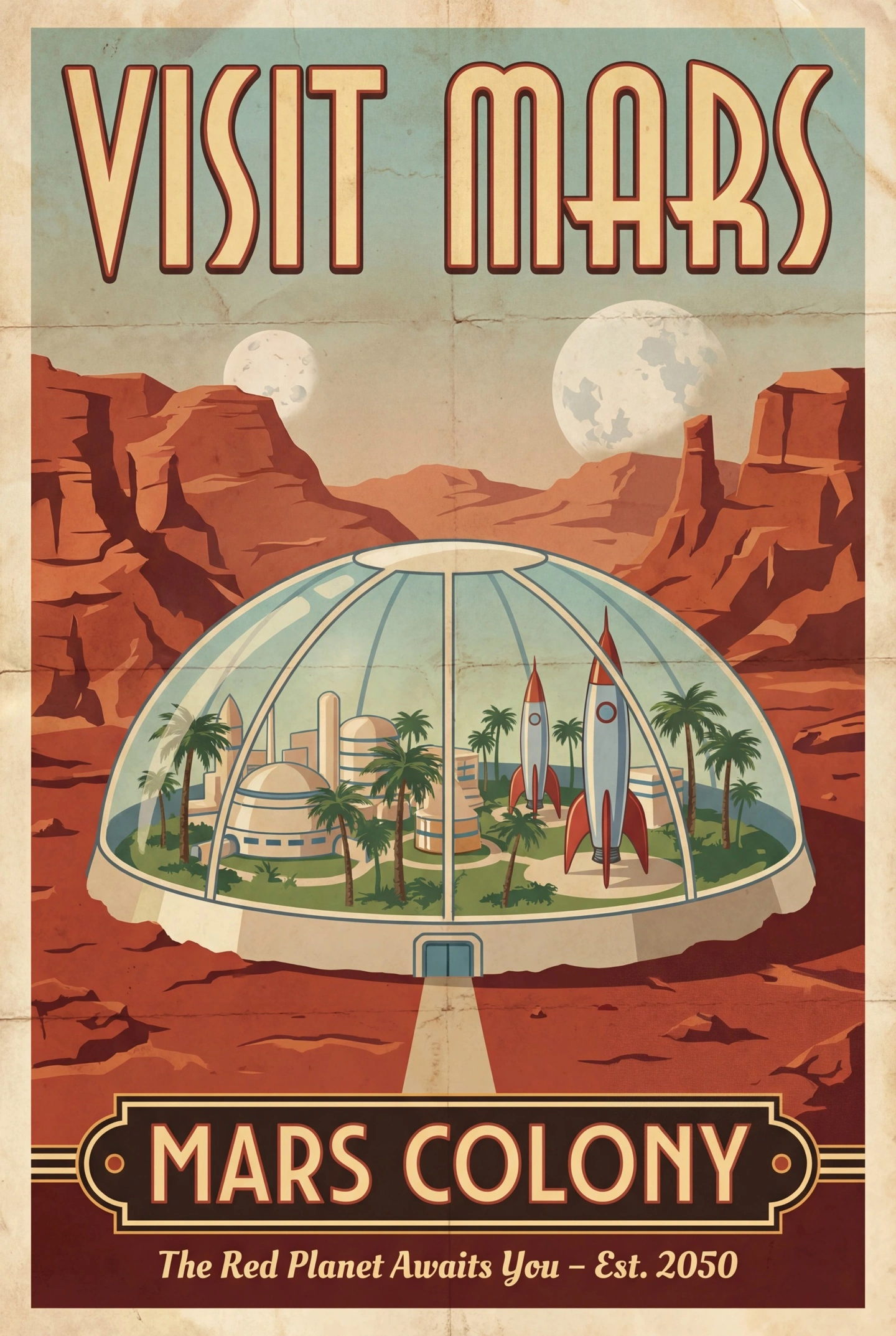 提示词:A vintage travel poster for "MARS COLONY." The main visual is a retro-futuristic biodome on a red landscape. Large, bold Art Deco typography at the top says "VISIT MARS," and smaller text at the bottom says "The Red Planet Awaits You - Est. 2050." Texture of worn paper. —ar 2:3