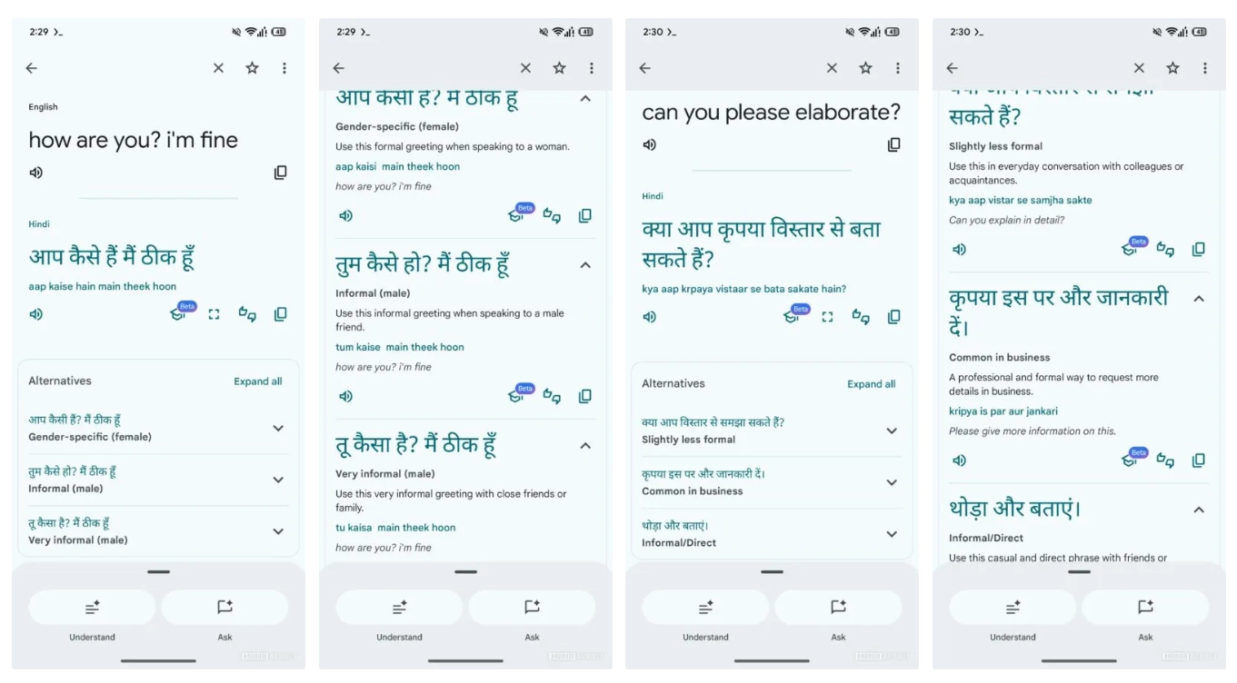 该媒体还指出谷歌翻译为补充背景信息,已着手测试“理解(Understand)”和“提问(Ask)”按钮,而“显示替代译法”极有可能与这两个功能打包推出,形成一套完整的 AI 翻译辅助工具链。
