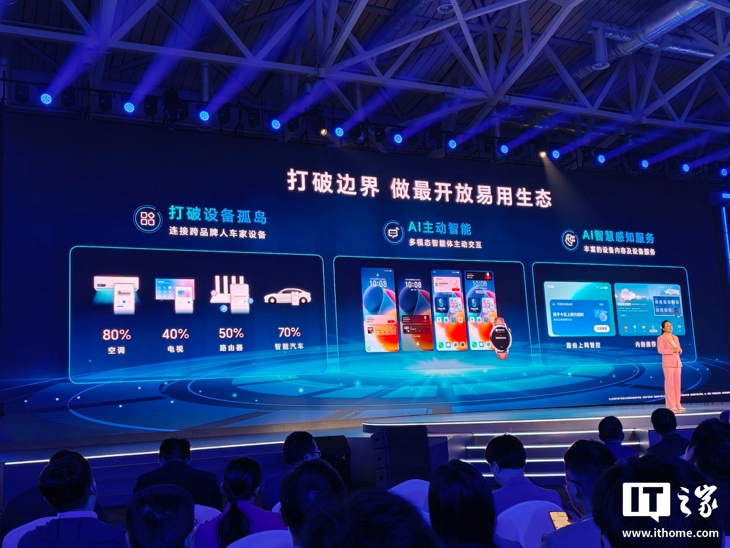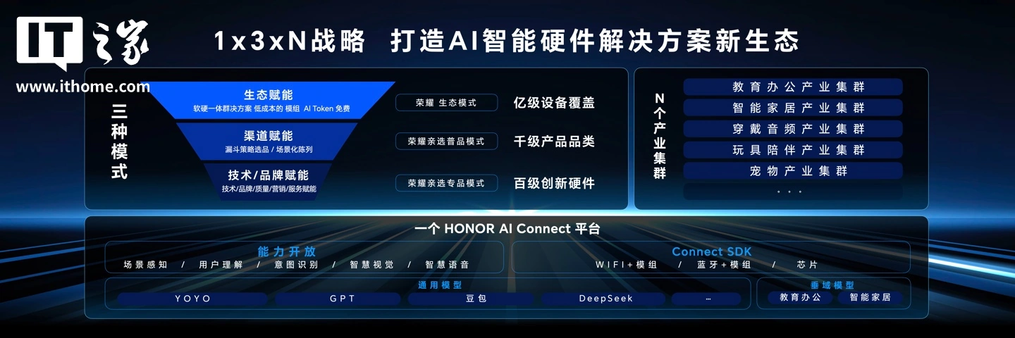 在本次生态大会上,荣耀产品线总裁方飞介绍了荣耀 AI 生态布局,提出了 1 x 3 x N 战略,一个平台,三项赋能,N 个产业集群,IT之家简要介绍如下: