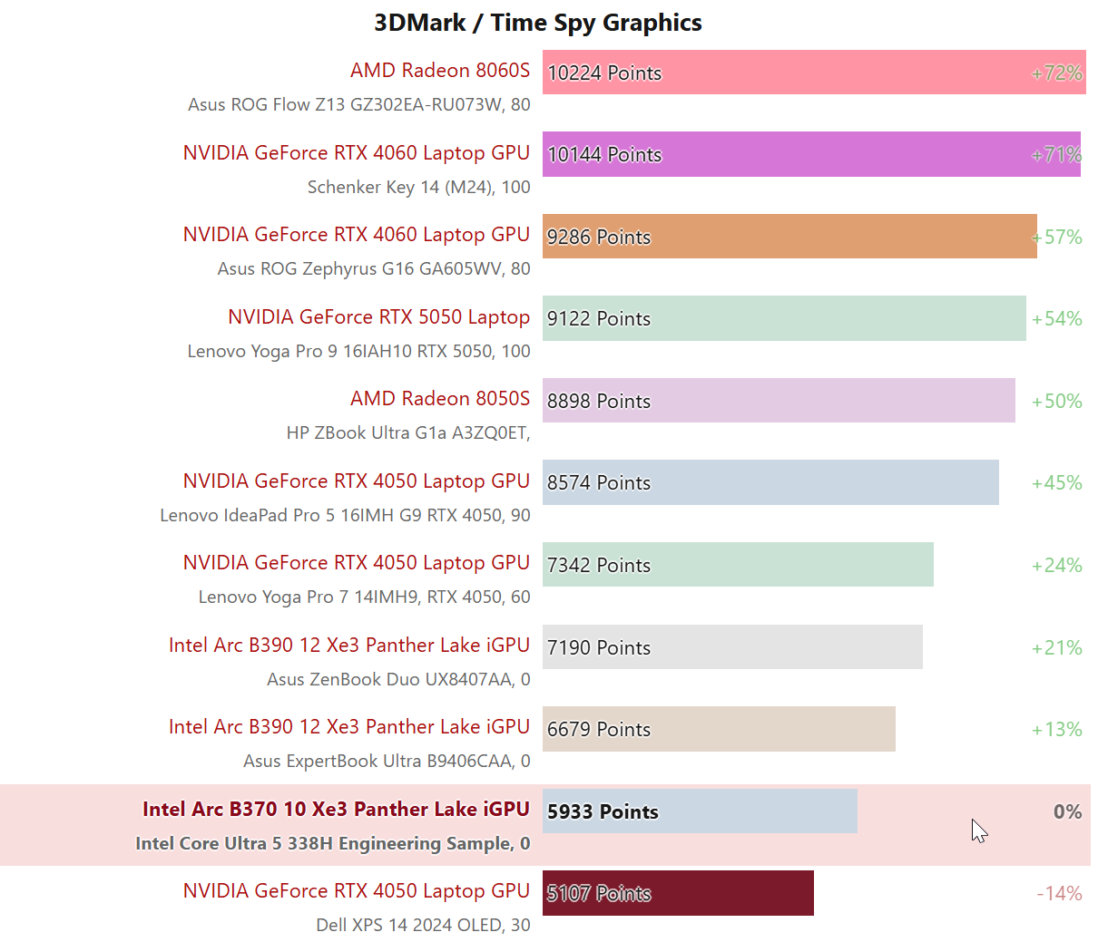 GPU性能上,锐炫B370在3DMark Time Spy测试中得分5933 分,而老大哥B390的得分则取决于所使用的笔记本电脑,分别为6679分和7910分,但无论如何,B390至少快13%。