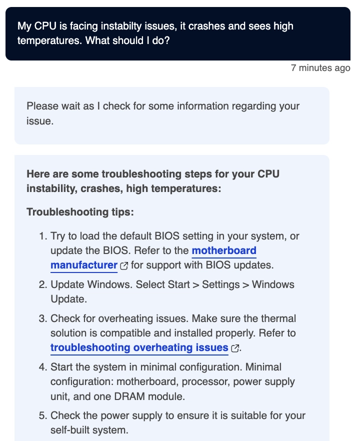 该媒体实际测试该助手,结果喜忧参半。在询问“CPU 不稳定”的解决方案时,系统虽然给出了更新 BIOS 和检查散热等标准建议,但也机械地建议用户“运行 CPU 压力测试”。