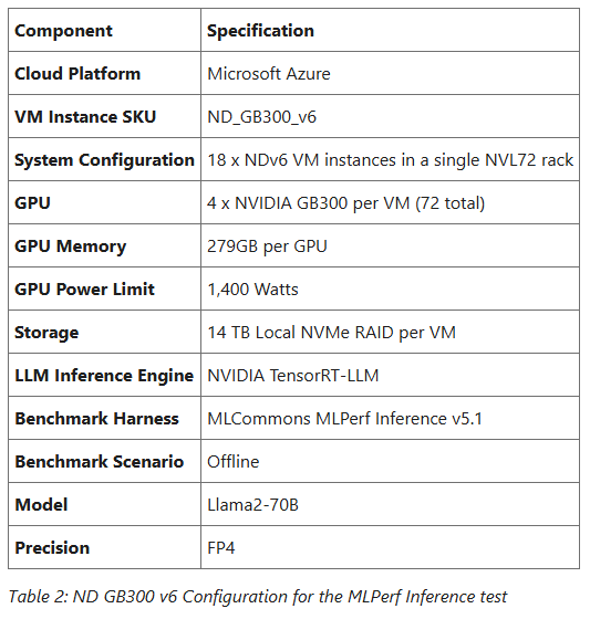 为验证性能提升,微软在单个 NVIDIA GB300 NVL72 域内的 18 个 ND GB300 v6 虚拟机上,分别运行了 MLPerf Inference v5.1 基准测试中的 Llama2 70B 模型(采用 FP4 精度),并使用 NVIDIA TensorRT-LLM 作为推理引擎。