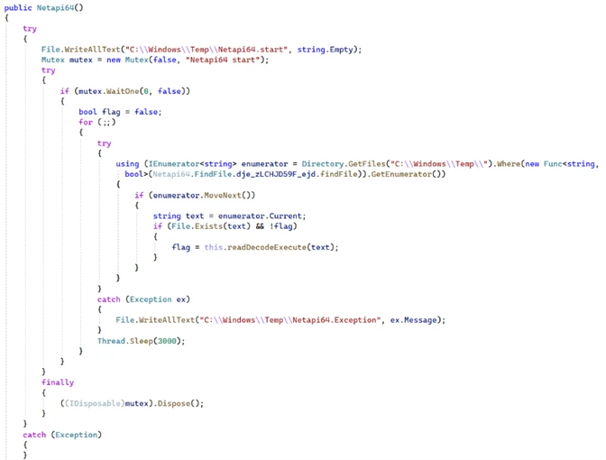 从技术实现上看,SesameOp 主要由一个加载器(Netapi64.dll)和一个基于.NET 开发的后门程序组成。为了躲避安全软件的扫描,攻击载荷采用了 AES 和 RSA 双重加密,并结合 GZIP 压缩技术。