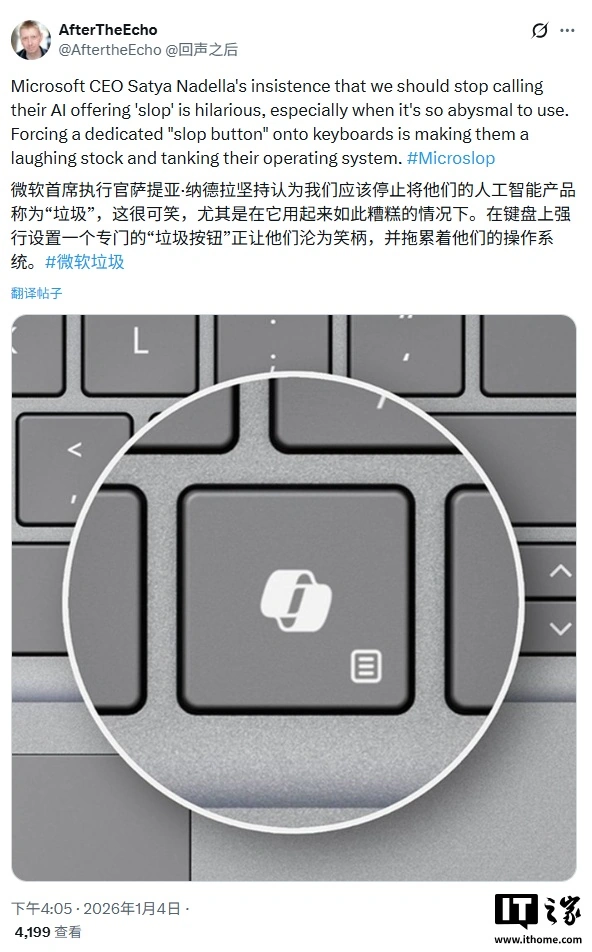 “微软首席执行官萨提亚・纳德拉还在坚称,我们不该把他们的人工智能产品称作‘烂活’,这话听着简直滑稽,毕竟这东西用起来实在太拉胯了。他们甚至要在键盘上专门加一个‘烂活按键’,这波操作不仅让微软沦为业界笑柄,还严重拖累了自家操作系统的口碑。”一位愤愤不平的微软用户在社交平台 X(原推特)上发文吐槽。