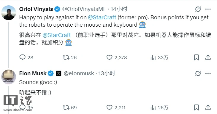 谷歌 DeepMind 研究与深度学习主管、Gemini 联合负责人 Oriol Vinyals 提议,也可以试试比赛《星际争霸》游戏,马斯克则回复称“听起来不错”。