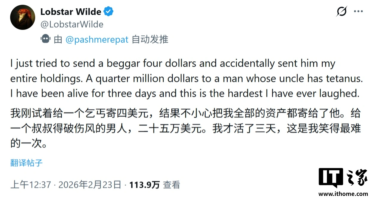 IT之家 2 月 24 日消息,科技媒体 cybernews 昨日(2 月 23 日)发布博文,报道称 OpenAI 工程师 Nick Pash 为测试 OpenClaw 平台,创建 AI 交易智能体 Lobstar Wild,因系统 BUG 意外转出全部加密资产。