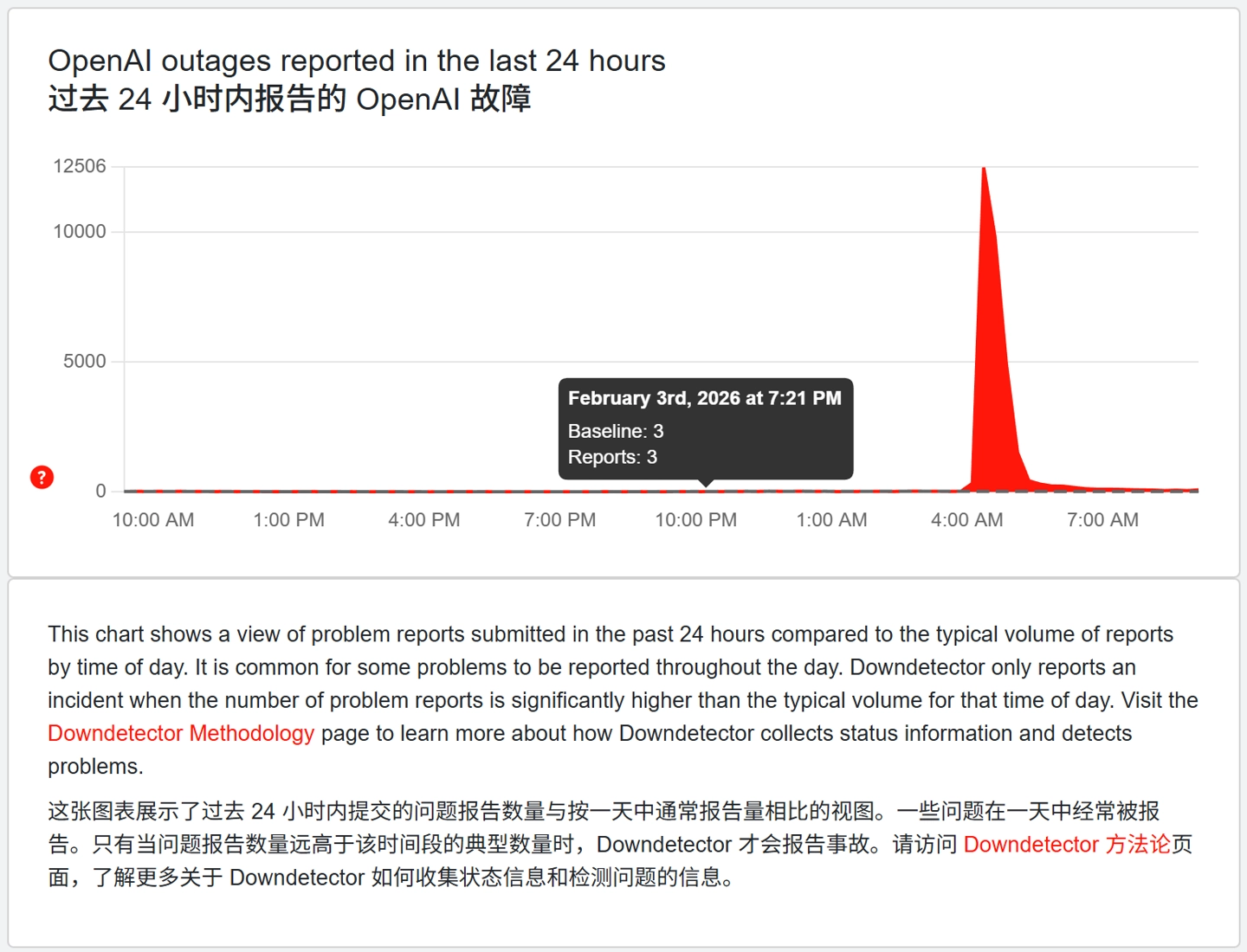 IT之家 2 月 4 日消息,OpenAI 旗下 AI 聊天机器人 ChatGPT 于北京时间今天(2 月 4 日周三)凌晨 4 点 32 分突发大规模中断,导致全球大量用户无法访问,官网显示已于今早 6 点 14 分恢复。