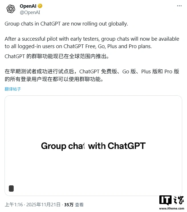 IT之家 11 月 21 日消息,OpenAI 今天(11 月 21 日)发布公告,为 ChatGPT 全面推出群聊功能。该功能此前经过小范围测试并获得积极反馈,现已面向所有已登录用户开放,覆盖免费版、Go 版、Plus 版及 Pro 版套餐。