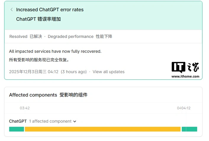 IT之家查询 OpenAI 官方状态页面,发现 12 月 2 日和 12 月 3 日均出现了状态不稳定情况。第一次故障于北京时间 12 月 2 日 2 点 08 分出现问题,并已于当天 2 点 37 分采取缓解措施,并正在监测恢复情况;于 3 点确认已完全恢复。IT之家附上相关截图如下: